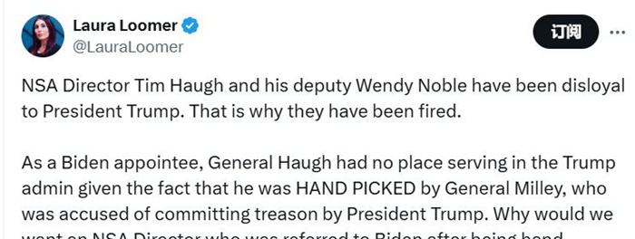 她指责蒂莫西·霍是由美国参谋长联席会议前主席马克·米利“亲自挑选”之人,而米利本人已经被特朗普指“叛国”。鲁默质疑,“为什么我们要一个由米利挑选、拜登提名的人来当国安局局长?”她强调,美国国安局是最重要的情报机构,“不能允许由拜登提名的人选来担此重任”。