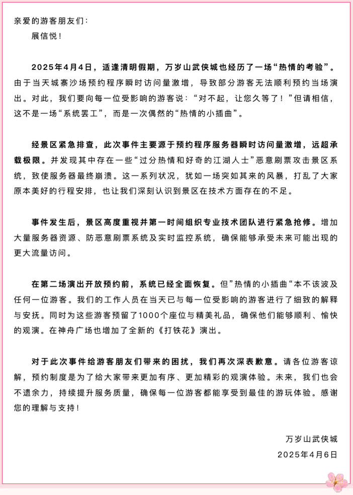 4月6日,河南开封万岁山武侠城景区发布致歉信:由于4月4日当天城寨沙场预约程序瞬时访问量激增,导致部分游客无法顺利预约当场演出。经景区紧急排查,此次事件主要源于预约程序服务器瞬时访问量激增,远超承载极限。并发现其中存在一些“过分热情和好奇的江湖人士”恶意刷票攻击景区系统,致使服务器最终崩溃。景区表示,在第二场演出开放预约前,系统已经全面恢复。