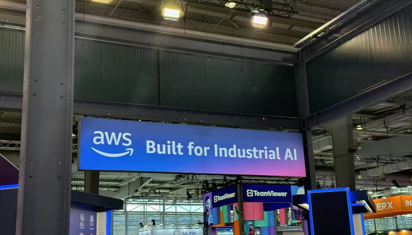 步入“数字生态系统(Digital Ecosystems)”展区的15馆,迎面而来的就是亚马逊云科技(AWS) 1400平方米的巨大展台,环形的LED屏上循环闪动着“专为工业人工智能打造(Built for Industrial AI)”的标语。