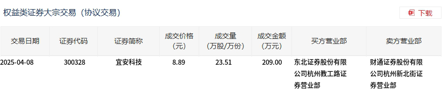4月8日,宜安科技大宗交易成交23.51万股,成交额209万元,占当日总成交额的0.36%,成交价8.89元,较市场收盘价8.69元溢价2.3%。