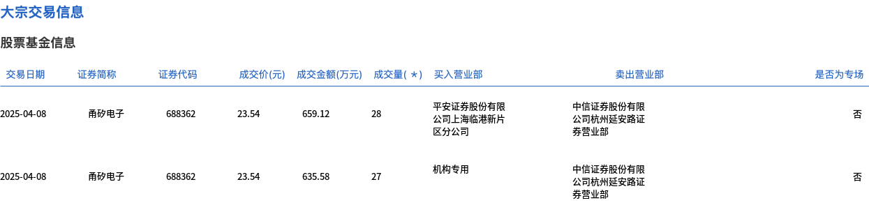 4月8日,甬矽电子大宗交易成交55万股,成交额1294.7万元,占当日总成交额的3.72%,成交价23.54元,较市场收盘价24.78元折价5%。