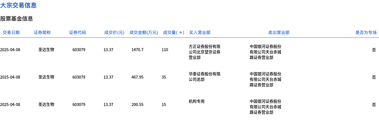4月8日,圣达生物大宗交易成交160万股,成交额2139.2万元,占当日总成交额的5.12%,成交价13.37元,较市场收盘价15.67元折价14.68%。