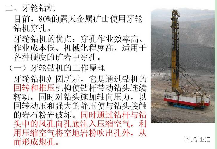 牙轮钻机是我国大型露天矿山广泛使用的一种高效率的穿孔设备。按穿孔尺寸计算,牙轮钻机穿孔的速度一般为4000~6000m/月,最高可达10000m/月以上;若按台年穿爆量计算,一般为400万~600万t,最高可达1200万一1400万t,是钢丝绳冲击钻机的4~5倍。牙轮钻机的钻孔速度比潜孔钻机约高40%~100%。