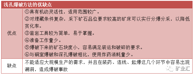 浅孔爆破法炮孔直径较小(一般为28—75mm),孔深一般为5—8m。由于孔径、孔深的限制,其爆破量较少,不能满足大型装运设备的要求。因此,这种爆破方法主要用于小型露天矿或在地质条件较复杂,以及对爆破下来的矿石在几何形状上有特殊要求的情况下使用。大、中型露天矿仅用这种爆破方法进行二次爆破处理根底或工作面上悬浮的孤石。