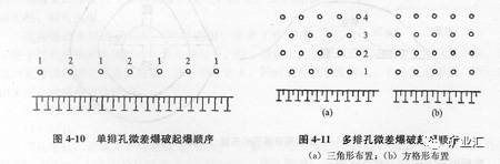 多排孔微差爆破:微差爆破是指相邻炮孔中药包在极短时间(以ms计算)内按预先设计的次序顺次起爆的爆破方法。