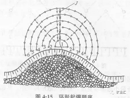 (4)爆破排数与起爆顺序。挤压爆破的排数一般在四排以上。各排的起爆/顷序,除可采用普通微差爆破的几种起爆顺序外,还有一种环形起爆顺序,如图4—15所示。