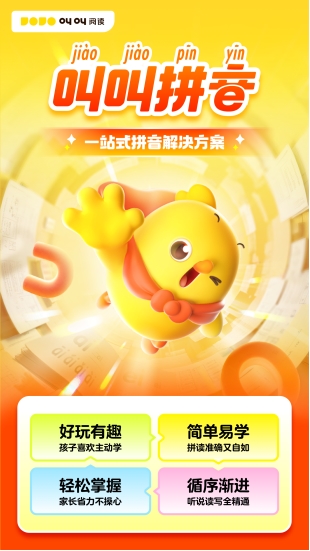 叫叫相关负责人表示,叫叫一直将“让学习充满乐趣”视为自身的使命。此次推出的叫叫拼音,也将继续沿袭叫叫严谨的内容设计、孩子喜欢的IP、让孩子坚持的激励机制,以及基于数据和AI的反馈机制四大元素,希望能帮助更多孩子夯实拼音这一基础技能,并激发其自主学习热情。