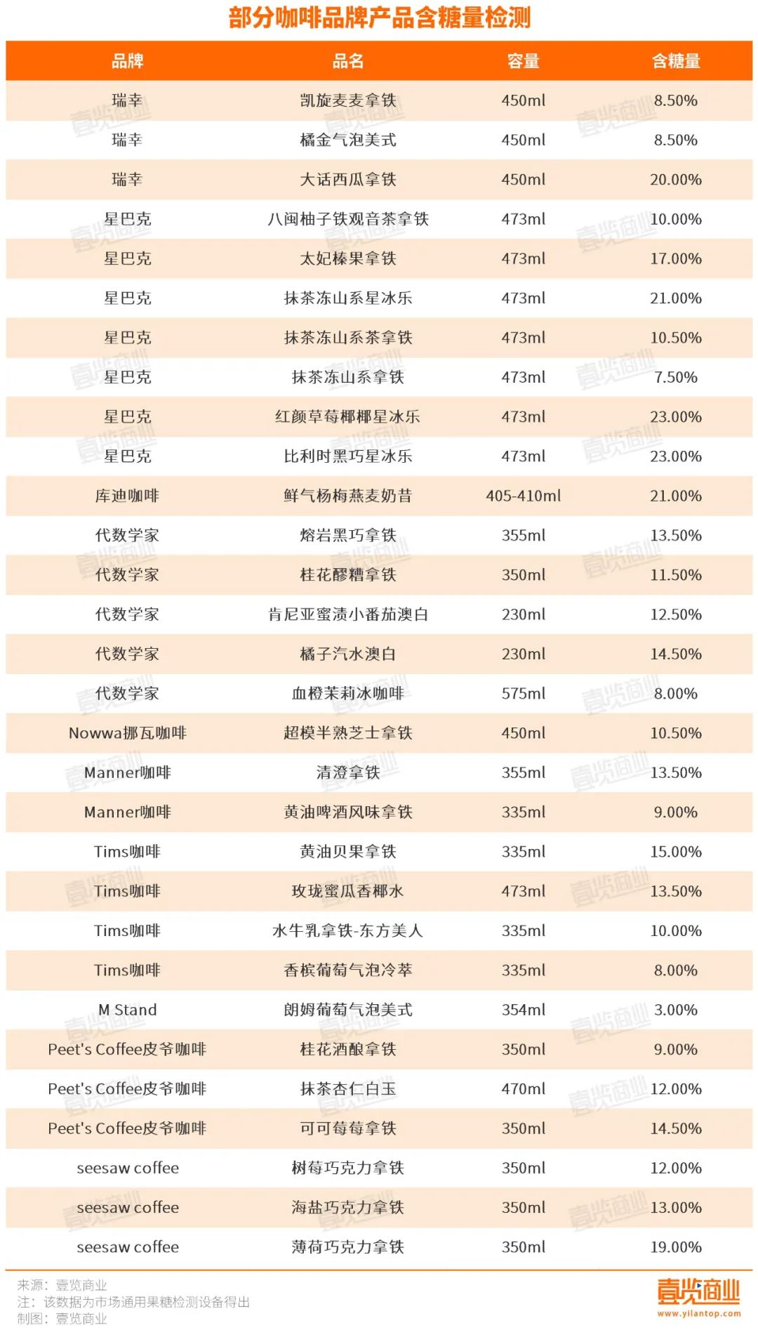 值得一提的是,随着咖啡奶茶化趋势愈发明显,整个行业产品的含糖量也在不断上升。茶咖观察评测过超25款咖啡,平均每款咖啡的含糖量在13%左右。按照350ml的容量计算,每喝下一杯咖啡,大约吃下了45.5克糖,热量在200卡左右,约等于半碗蛋炒饭。
