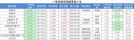 一季度排名垫底的10只管理期货策略产品中,月度亏损均超过15%。其中,和信盈通旗下的“和盈6号”最为惨烈,一季度净值遭遇腰斩,该产品2016年5月成立,今年初最高净值到1.646,截至1季度末净值0.753。此外,“财智8号”、“泰诺1号”等一季度亏损超过30%。