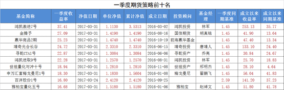 在前十名榜单中,鸿凯投资两只产品进驻,其中,“鸿凯激进7号”一季度收益率为37.41%,位居榜首,国信期货旗下的“金腾予”和前海赢华基金旗下的“赢华商品2期”分别以27.09%,25.23%位居第二名和第三名。