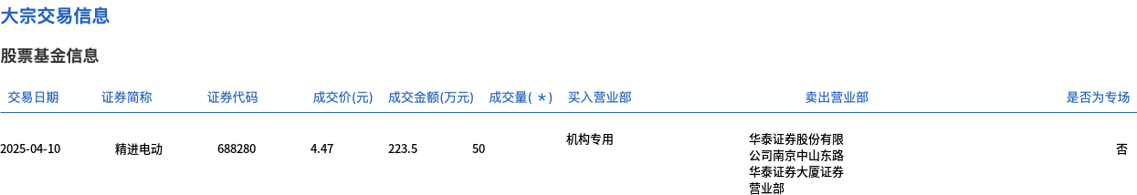 4月10日,精进电动大宗交易成交50万股,成交额223.5万元,占当日总成交额的4.29%,成交价4.47元,较市场收盘价4.52元折价1.11%。