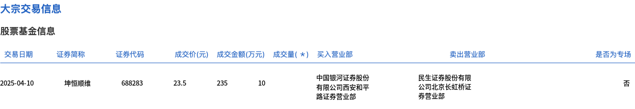 4月10日,坤恒顺维大宗交易成交10万股,成交额235万元,占当日总成交额的14.13%,成交价23.5元,较市场收盘价24.43元折价3.81%。