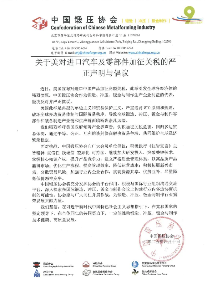 4月11日,中国锻压协会发布关于美对进口汽车及零部件加征关税的严正声明与倡议。协会表示,美国此举是典型的单边主义和贸易保护主义,严重违背WTO原则和规则,破坏全球多边贸易体制与国际贸易秩序,导致全球锻造、冲压、钣金与制作零部件和装备制造产业链和供应链面临断裂紊乱风险。协会强烈呼吁美国政府倾听产业界声音,认识加征关税危害,回归多边贸易体制,通过平等、公正、互利的谈判协商解决贸易争端,共同维护全球经济繁荣稳定。