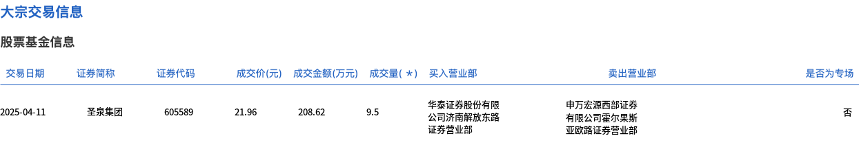 4月11日,圣泉集团大宗交易成交9.5万股,成交额208.62万元,占当日总成交额的0.71%,成交价21.96元,较市场收盘价24.96元折价12.02%。