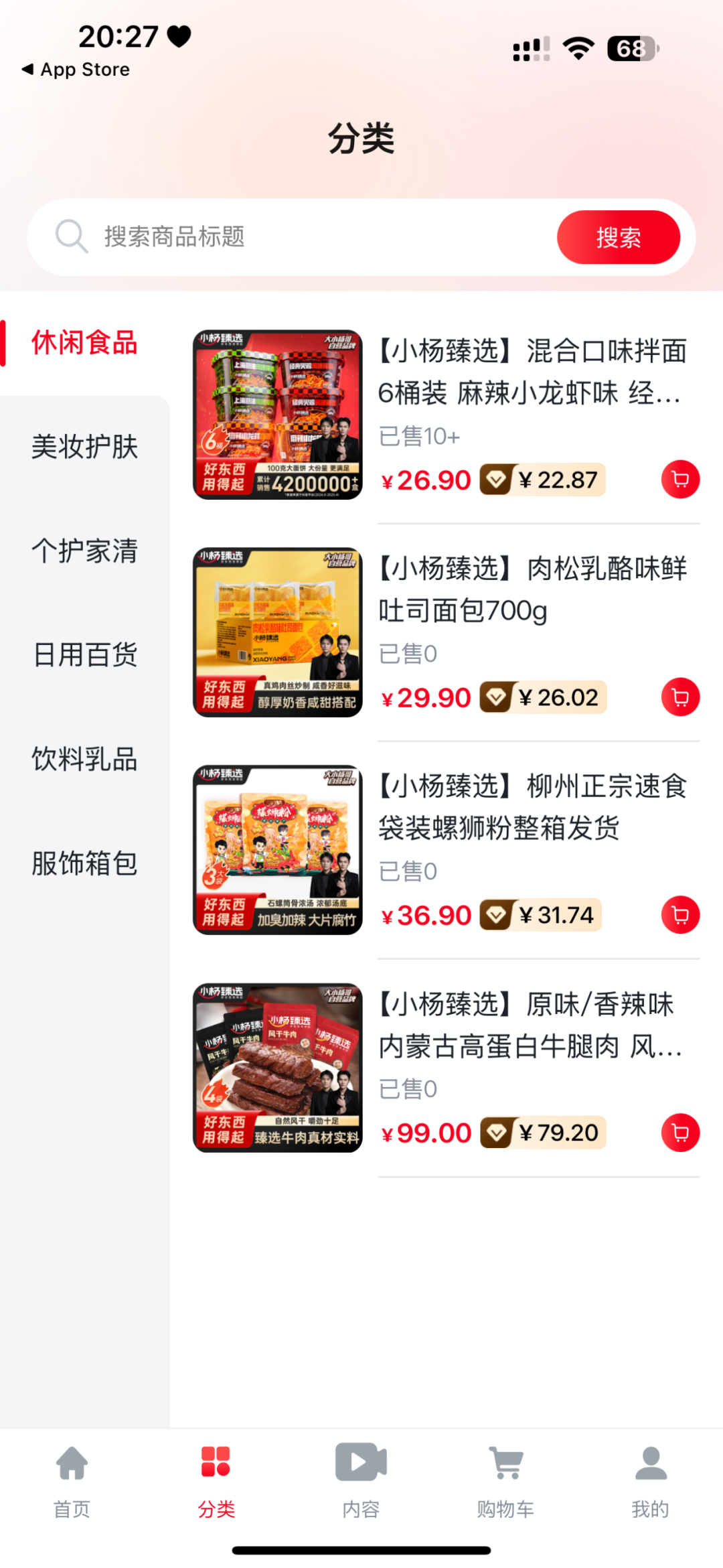 从目前小杨臻选APP来看,产品算不上丰富,以复刻抖音直播间爆款为主。商城分为休闲食品、美妆护肤、个护家清、日用百货、饮料乳品、服饰箱包五大板块,包含40种左右的商品。