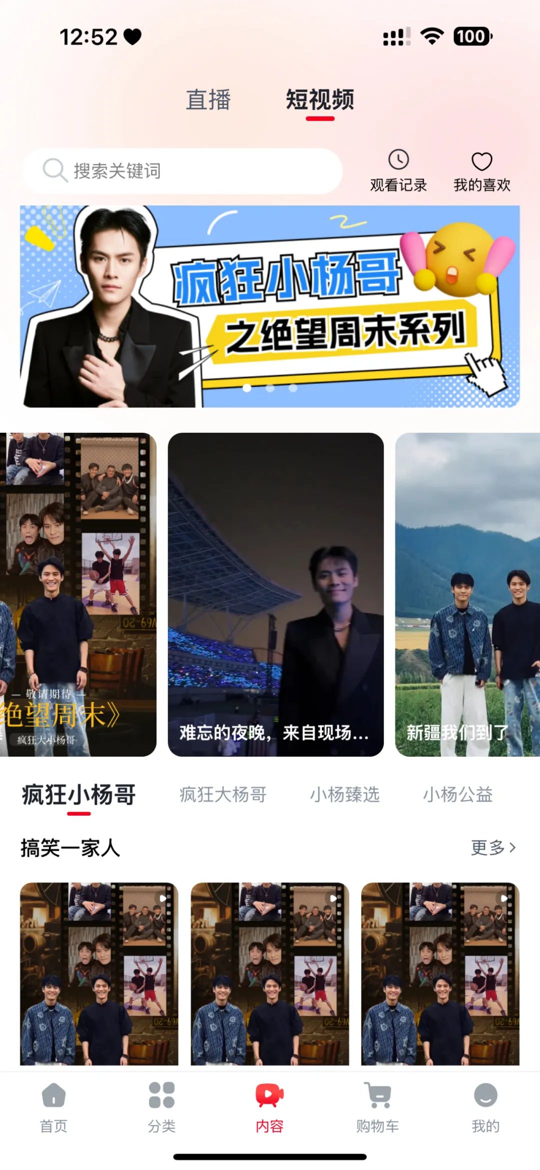 除了商城外,小杨臻选APP还专门设置了一个“内容”频道。内容频道之下,除了直播间,还有“视频”栏目。视频内容以大小杨哥自制的各类家庭整蛊短视频系列、短剧系列为主,突出大小杨哥的IP属性。