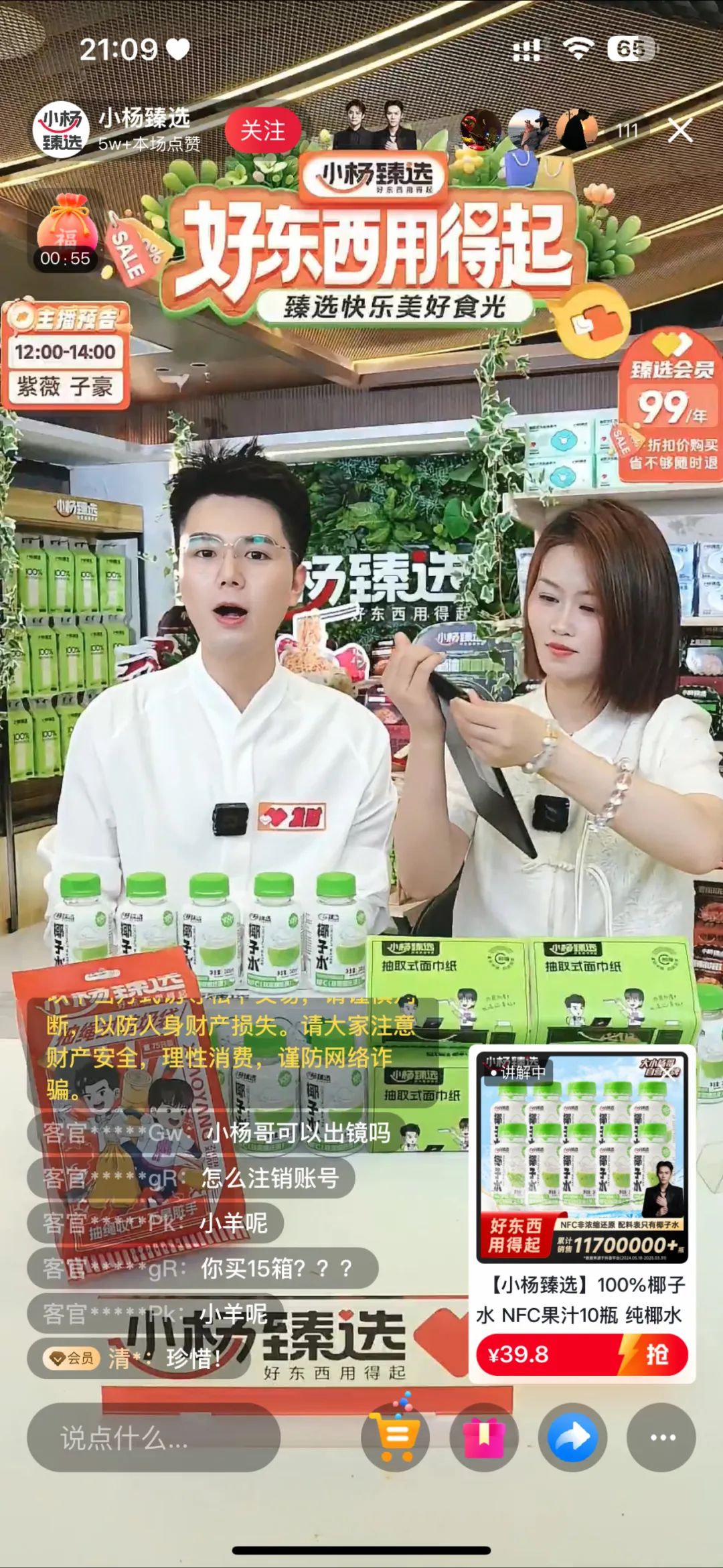 今年1月,小杨臻选账号在视频号低调复播,进行年货节专场直播。直播当天的在线观看人数超过了14万。在产品和直播风格上,小杨臻选视频号可以看作是为小杨臻选自营APP铺垫和预热。