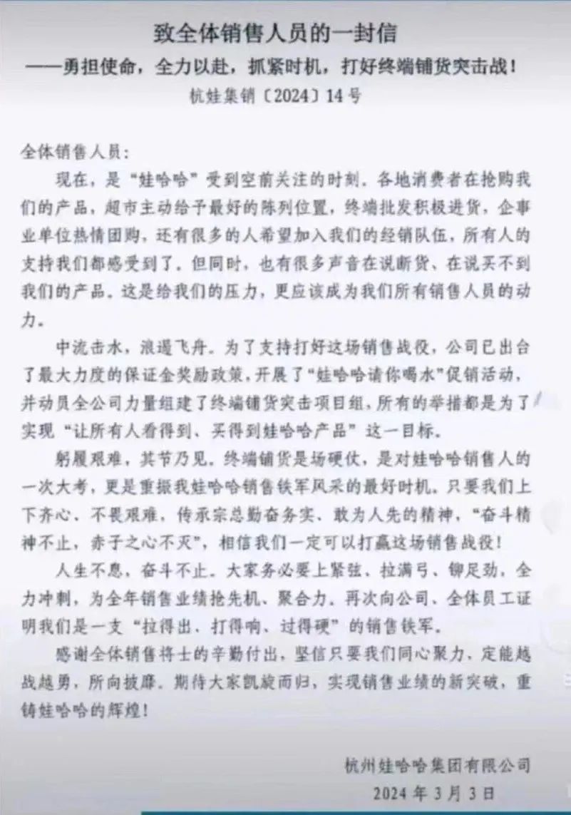 2024年3月,社交媒体上流传出来源于娃哈哈的《致全体销售人员的一封信》,这份信的核心观点是要打好终端铺货突击战,措施是大力度奖励、组建铺货项目组等,最终的目标是“让所有人看得到、买得到娃哈哈产品”。