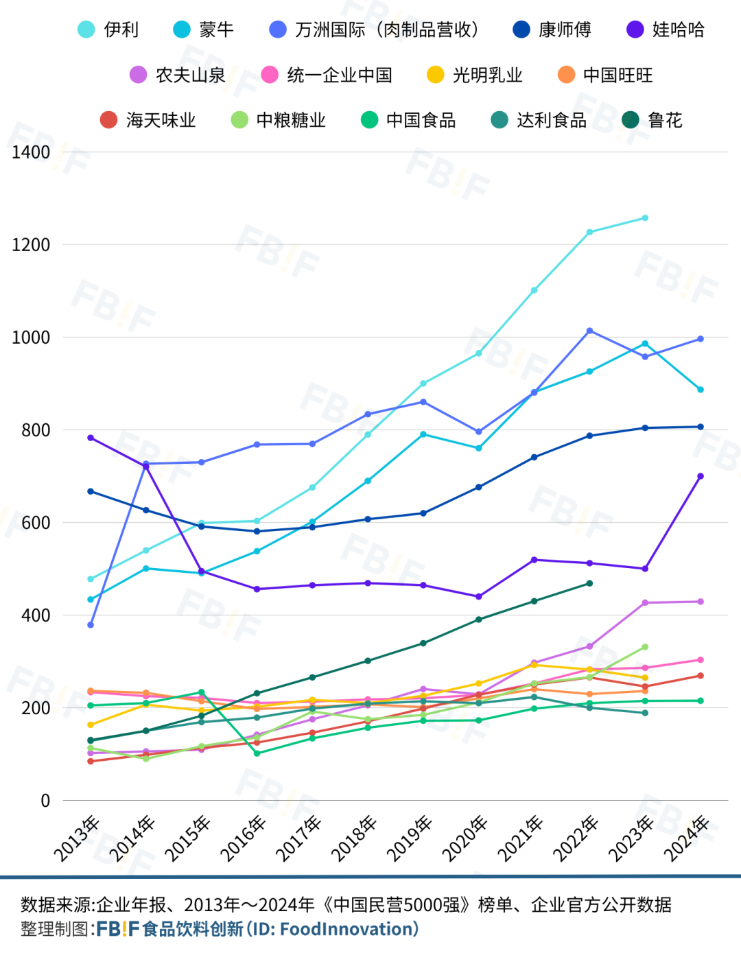 总体而言,2013年~2024年间,中国主要食品饮料企业的营收虽有小幅波动,但整体保持增长态势。