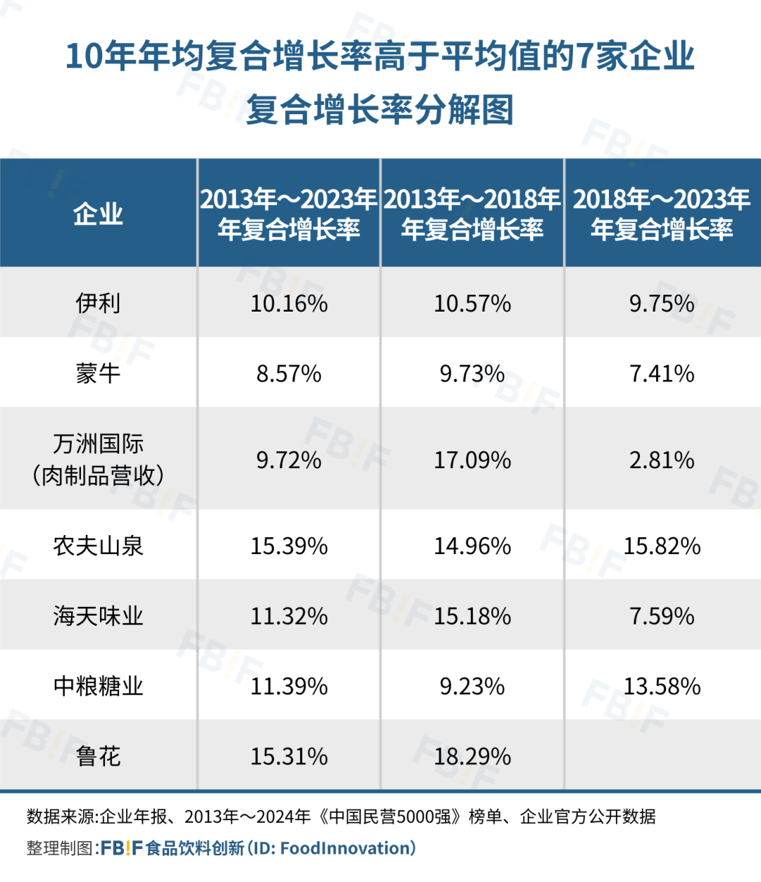 持续领跑型:伊利、蒙牛、万洲国际(肉制品营收)、农夫山泉、海天味业、中粮糖业以及鲁花,这7家企业10年年均复合增长率高于平均值。