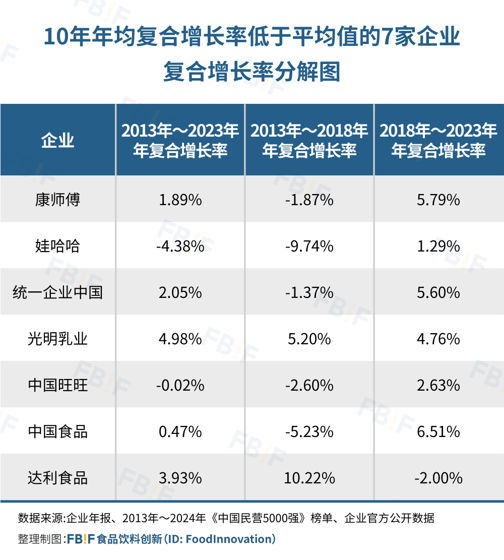 复苏型:康师傅、娃哈哈、统一企业中国、光明乳业、中国旺旺、中国食品、达利食品,这7家企业10年年均复合增长率低于平均值。