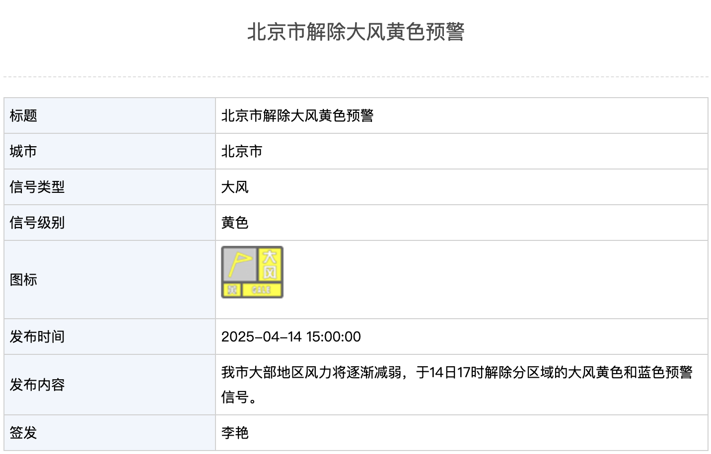 据北京市气象局网站,北京市解除大风黄色预警:我市大部地区风力将逐渐减弱,于14日17时解除分区域的大风黄色和蓝色预警信号。