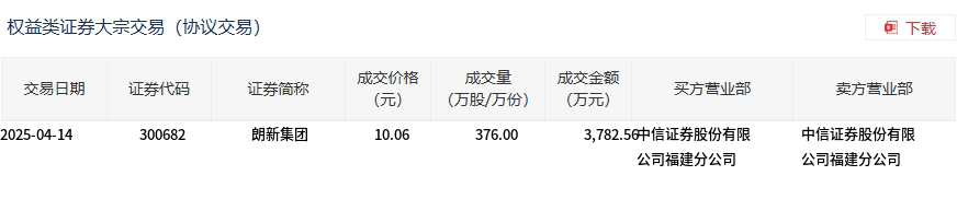 4月14日,朗新集团大宗交易成交376万股,成交额3782.56万元,占当日总成交额的13.2%,成交价10.06元,较市场收盘价12.25元折价17.88%。