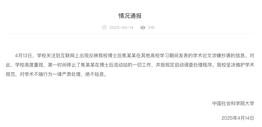 4月14日,中国社会科学院大学发布情况通报:4月13日,学校关注到互联网上出现反映我校博士后焦某某在其他高校学习期间发表的学术论文涉嫌抄袭的信息。对此,学校高度重视,第一时间停止了焦某某在博士后流动站的一切工作,并按规定启动调查处理程序。我校坚决维护学术规范,对学术不端行为一律严肃处理,绝不姑息。