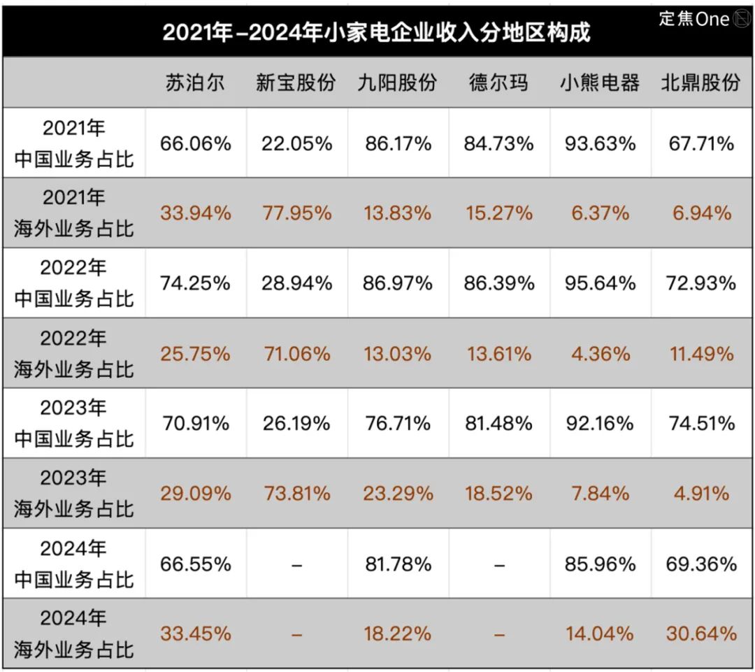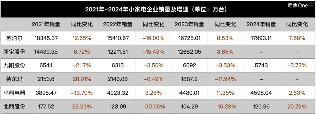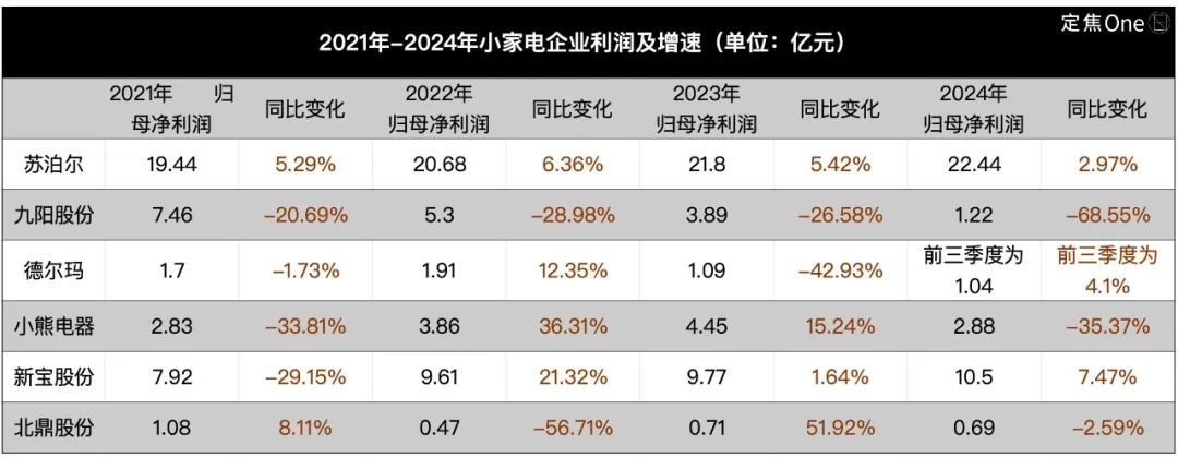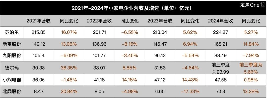 「定焦One」选取了六家小家电行业的上市公司作为代表,通过它们2021年-2024年的业绩,观察这一行业的走势。