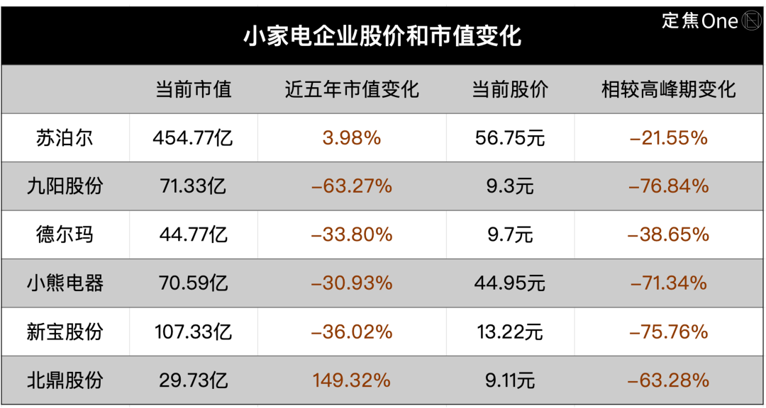 资本市场对小家电赛道的信心滑坡已反映在股价走势中。截至4月14日收盘,六大企业股价较历史高点均出现缩水,九阳股份、小熊电器、新宝股份跌幅均超70%。