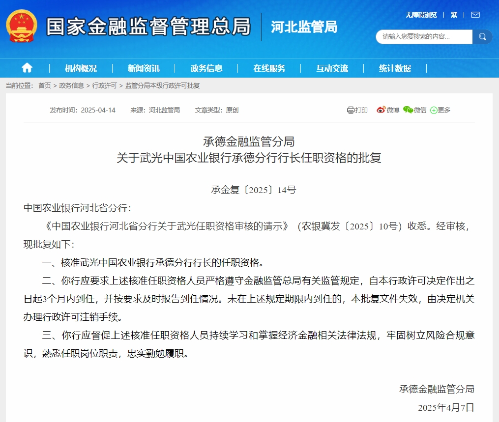 据国家金融监督管理总局网站显示,承德金融监管分局核准武光中国农业银行承德分行行长的任职资格。