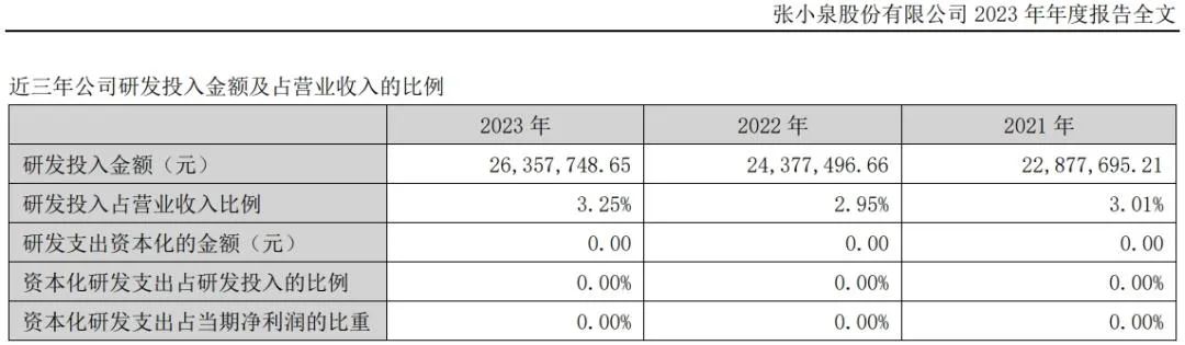 2021年至2023年,公司销售费用分别为1.17亿元、1.46亿元和1.48亿元,即使是在营收下降的情况下,费用也未收缩。与之对应的,是从2021年至2023年,张小泉的产品研发费用分别只占3.01%、2.95%和3.25%,即便如此,张小泉还坚持分红,三年里累计分走1.4亿元,其中超半数进了实控人的口袋。