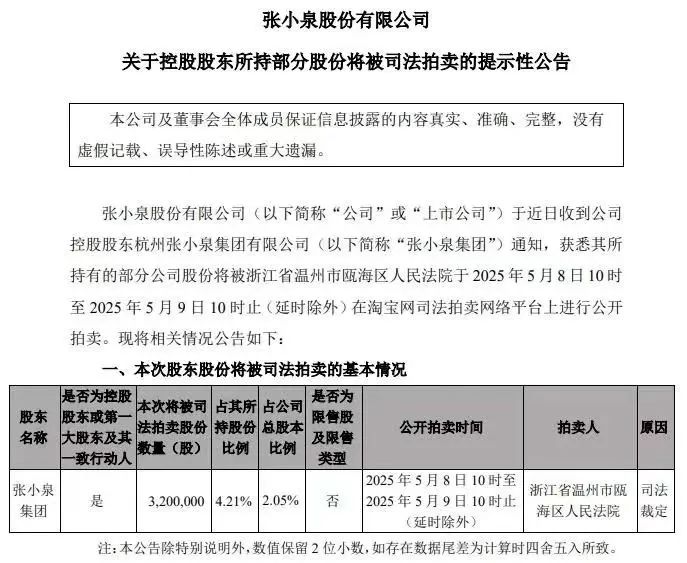 紧接着,4月1日,杭州张小泉集团有限公司又新增两条被执行人信息,执行法院均为上海市静安区人民法院,执行标的合计超4700万元;4月2日晚间,张小泉公告称,张小泉集团是上市公司张小泉的控股股东,张小泉集团所持320万股上市公司股份,将于5月8日在淘宝司法拍卖平台上拍卖。