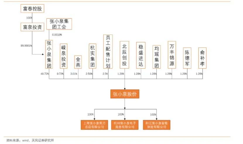2000年后,随着国有企业改革深化,张小泉逐步从国营企业转型为股份制公司。2001年,杭州张小泉集团有限公司正式成立,注册资本1681.7万元,由富春控股集团旗下的杭州复泉投资有限公司和工会共同持股,实际控制权逐渐集中于张国标、张樟生等家族成员。