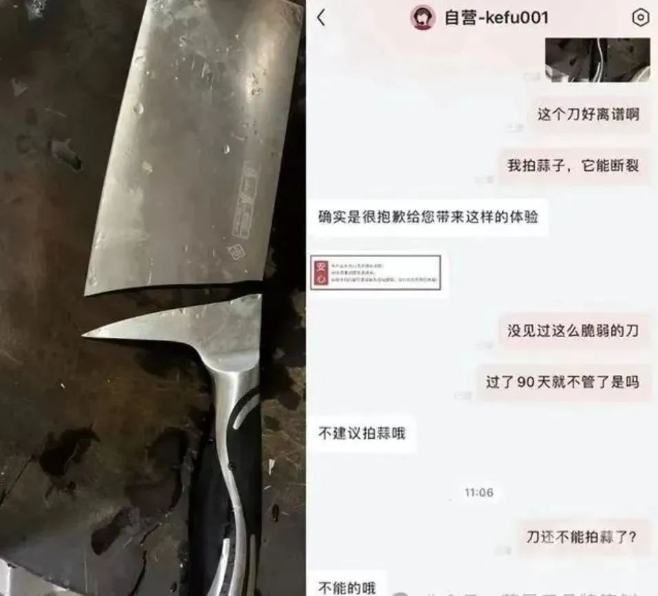 也是这一年,“张小泉菜刀不能拍蒜”的新闻引发社会舆论,起因是广州一女子用张小泉菜刀拍蒜后,菜刀断开,客服却淡定回应“菜刀不建议拍蒜”,总经理更是亲自下场称“中国人切菜方式不对”,不少网友纷纷跑到评论区留言,嘲讽张小泉是“装蒜刀”。