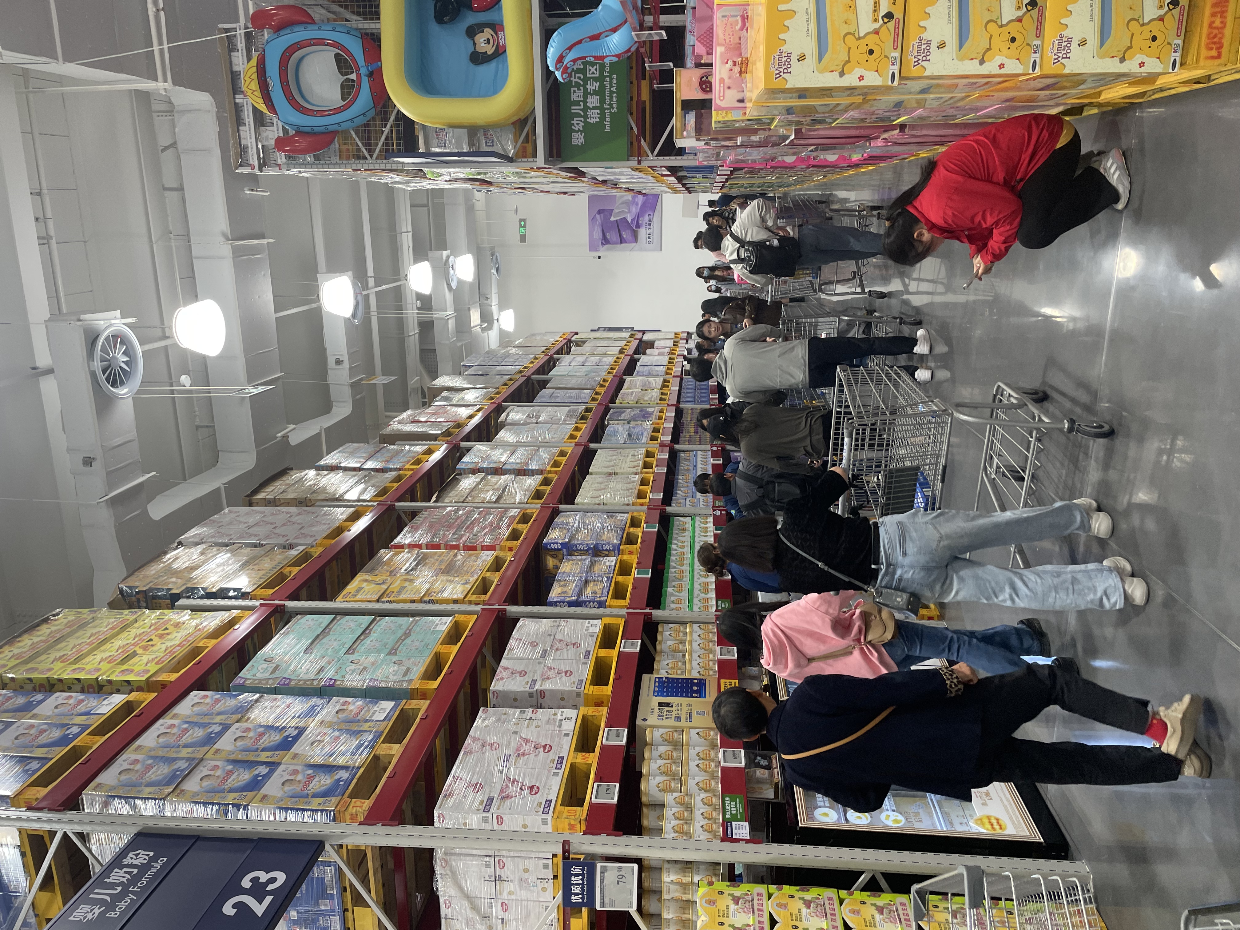 场外排队,进到商超里面也非常热闹。一楼,主要售卖电器、个人护理、服装和粮油品类,其中,纸尿裤、婴儿奶粉区域人流较多;玩具、宠物食品售卖处也聚集了不少人。