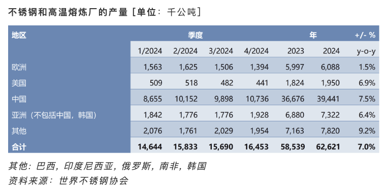 4月16日,世界不锈钢协会数据显示,2024年全球不锈钢粗钢产量为6260万吨,同比提高7%。