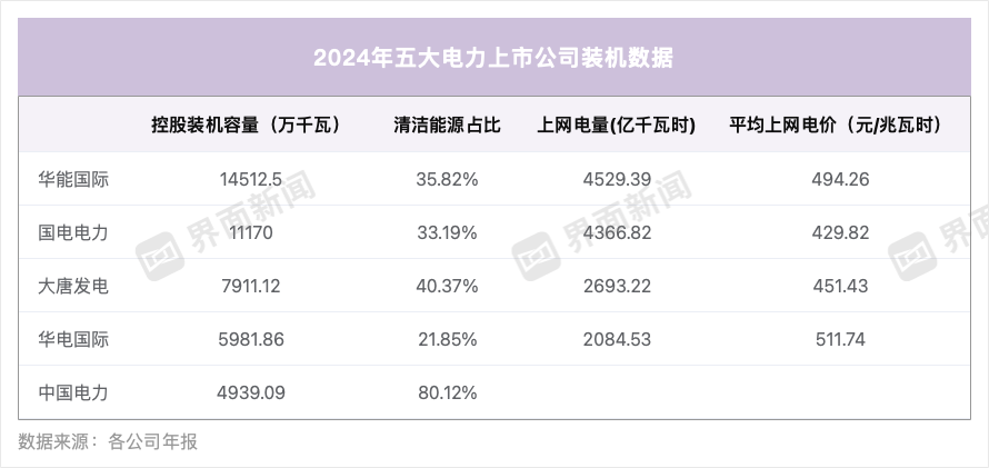 截至2024年末,华能国际控股装机容量最高,达到14512.5万千瓦,清洁能源占比为35.82%,同比提升4.58个百分点。