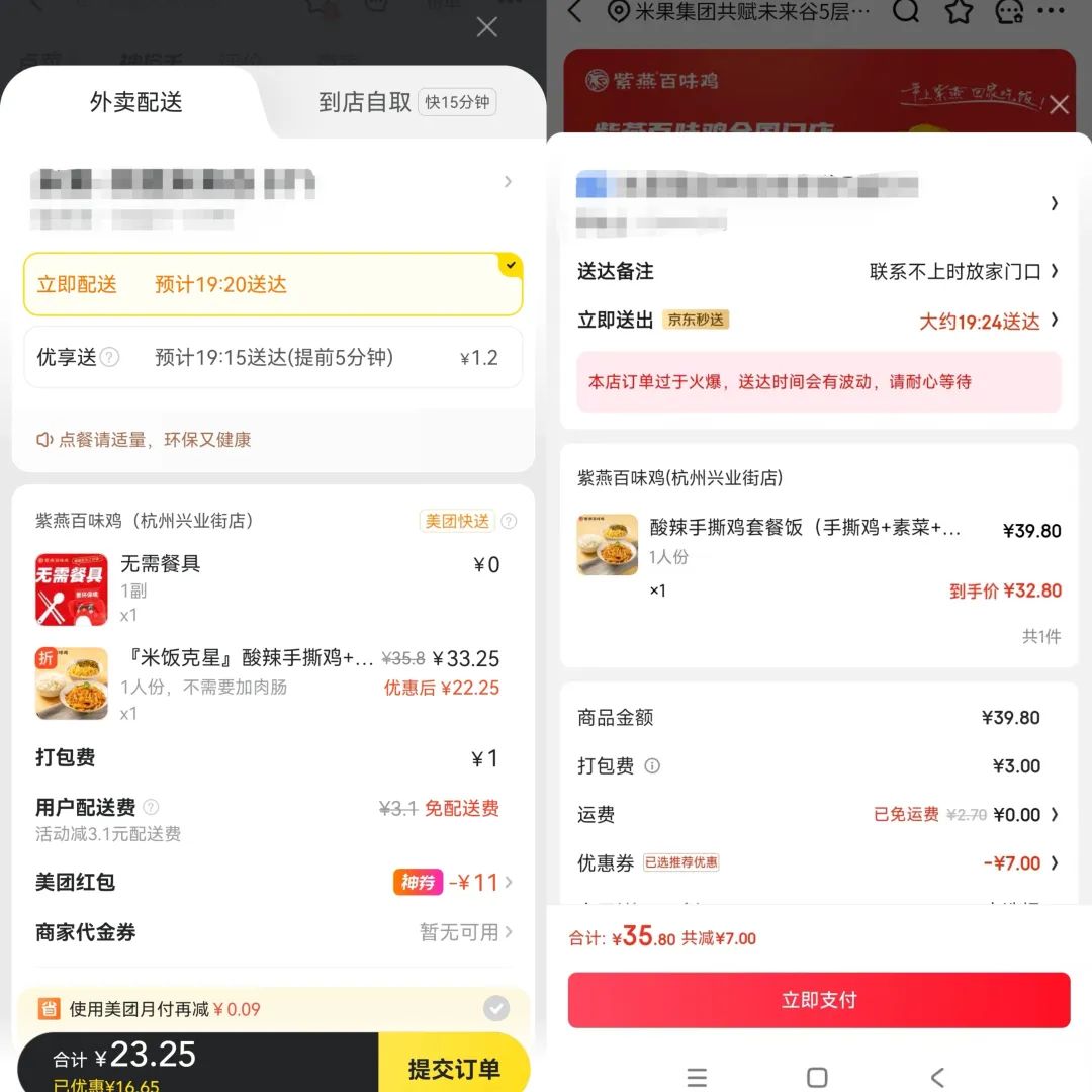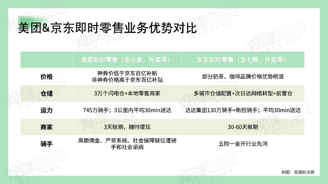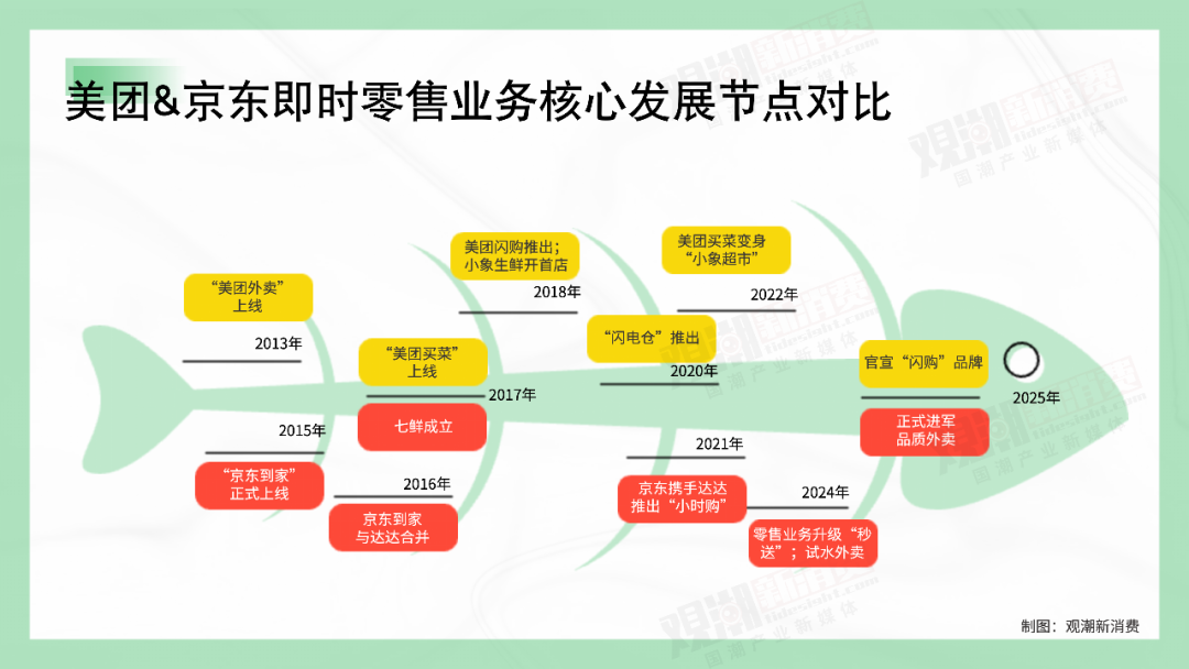 在即时零售板块,双方的业务几乎是一一对应的。除了外卖业务之外,还有“京东秒送”对应“美团闪购”,“七鲜”对应“小象超市”等等。