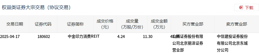 4月17日,中金印力消费REIT大宗交易成交11.3万股,成交额47.96万元,占当日总成交额的9.94%,成交价4.24元,较市场收盘价4.244元折价0.09%。