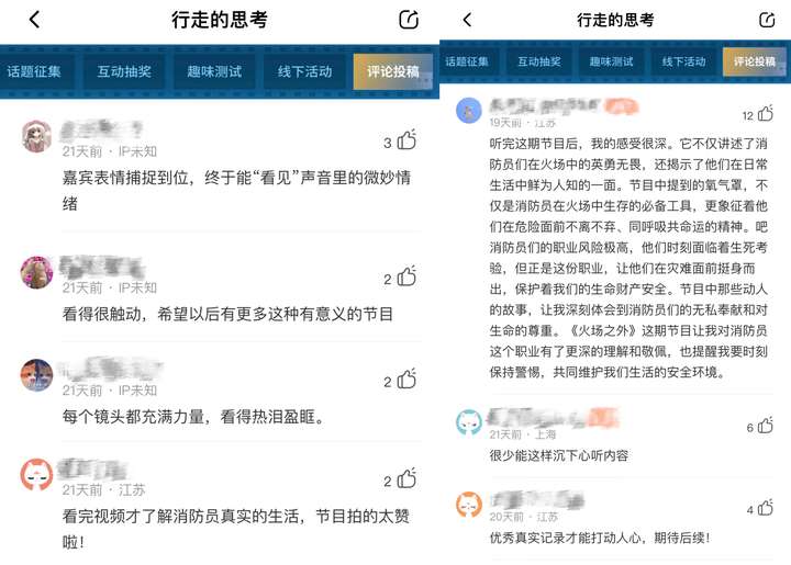 除了人物故事本身颇具代入感外,《行走的思考》对声音的处理也更加细致,以电影级声音制作标准进行剪辑和配乐,带给人更具沉浸感的视听体验。例如,在《火场之外》的两期节目中。无论是攀爬梯子的声音、穿救援服的声音、戴氧气面罩的呼吸声,都细致入微、让人“身临其境”,能清晰体验到出警时刻的紧张感。
