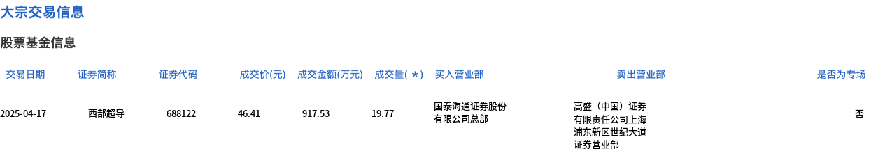 4月17日,西部超导大宗交易成交19.77万股,成交额917.53万元,占当日总成交额的3.66%,成交价46.41元,较市场收盘价46.41元持平。