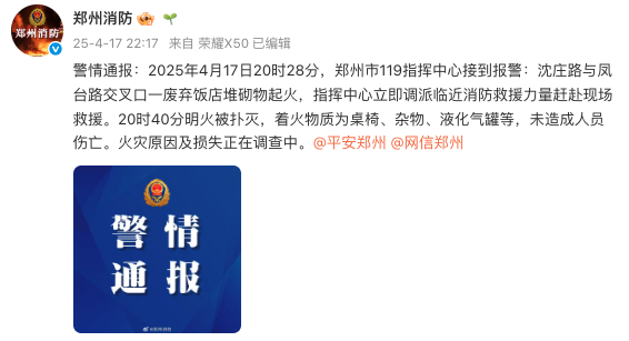 4月17日晚间,河南省郑州市消防救援支队发布警情通报:2025年4月17日20时28分,郑州市119指挥中心接到报警:沈庄路与凤台路交叉口一废弃饭店堆砌物起火,指挥中心立即调派临近消防救援力量赶赴现场救援。20时40分明火被扑灭,着火物质为桌椅、杂物、液化气罐等,未造成人员伤亡。火灾原因及损失正在调查中。