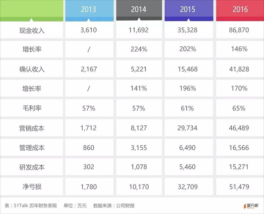 近几年,51Talk收入增速均在100%以上,2016年现金收入8.7亿元,确认收入4.2亿元。同时,毛利率也在逐渐提升,2016年达到64.82%。