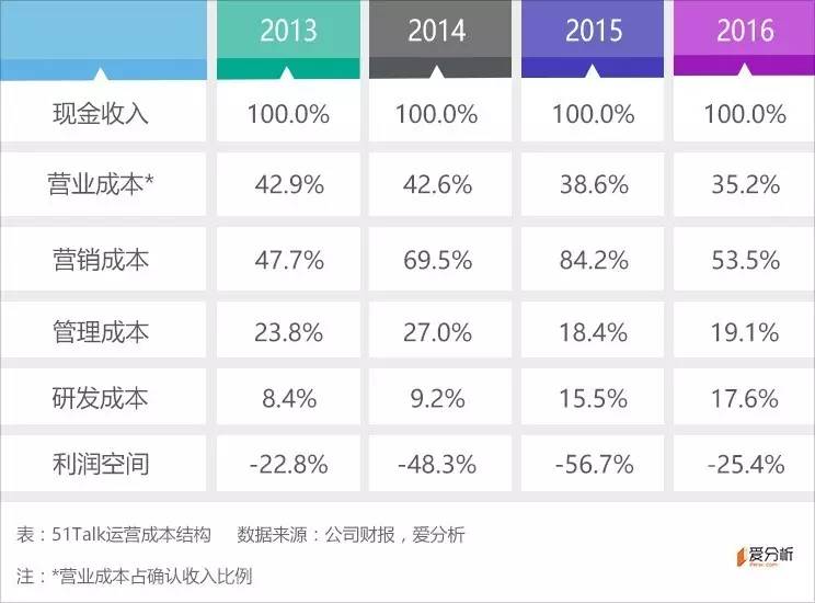 但另一方面,高昂的成本带来了较大的资金压力,亏损也在逐年扩大,2016年达到5.1亿元。由于公司有较高的递延收入,且营销和研发属于“预先”支出,所以,我们通过与现金收入的对比看一下51Talk的成本结构。