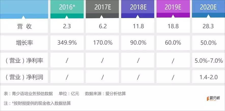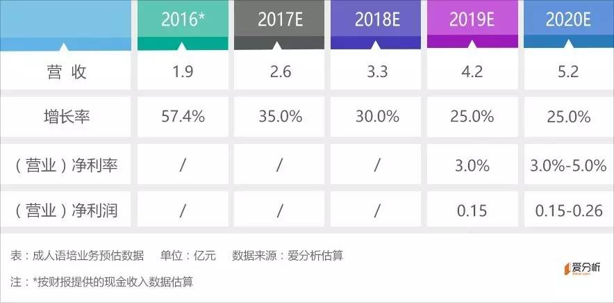 我们预计这一部分业务有望在2019年跑出利润,2020年预计营业净利润为0.15-0.26亿元。成人英语业务会最早盈利,但成长和利润空间有限,按20-25倍PE计算,估值3-6亿元。