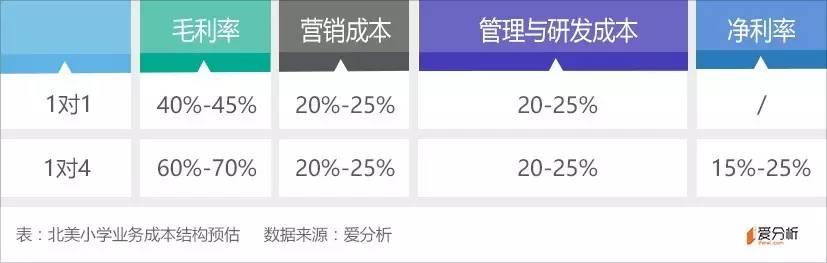 我们以1对4小班为例进行对比。根据目前市场情况,1对4小班的平均客单价为90元左右,北美教师的课酬即使按100元每节估算,仍有72%的毛利空间;考虑到由于教师资源竞争导致的课酬变化、以及客单价的变化,预计小班毛利率在60%-70%。综合来看,北美外教的小班课程预计净利空间为15%-25%。