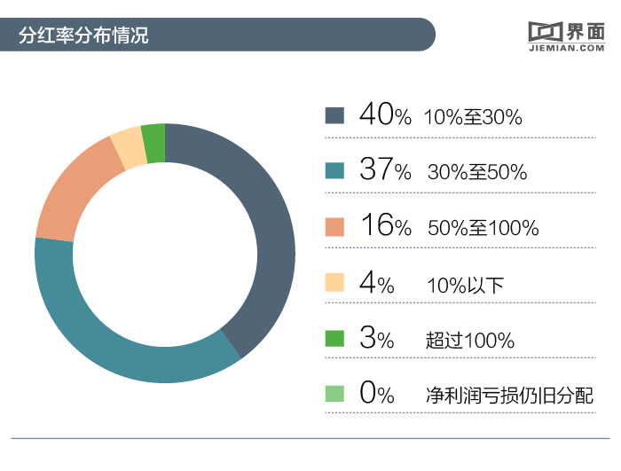 值得注意的是,46家公司的分红率超过100%,也就是说,这些公司16年年报拟分红金额超过了当年归属于母公司股东的净利润,其中摩恩电气(002451.SZ)、中百集团(000759.SZ)、莱美药业(300006.SZ)以及京蓝科技(000711.SZ)的分红率均超过了500%。而且查看这46家公司,界面新闻发现,通过此次分红,上述公司近三年累计分红金额占累计未分配利润的比例有了明显的提升。