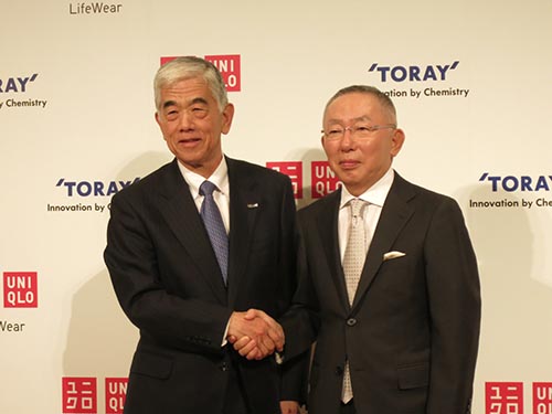 UNIQLO与日本东丽(TORAY)合作 UNIQLO联手东丽的独家纤维技术,推出冬季热门商品,HEATTECH吸湿发热衣系列。 UNIQLO董事长柳井正(右)、东丽社长日觉昭广(左)