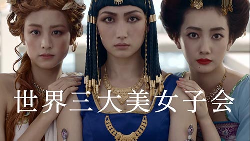 另外一则广告,则是以「世界三大美女会」为背景,齐聚一堂的希腊海伦、埃及艳后、唐朝杨贵妃(山本美月、香椎由宇、波瑠饰演),正在贵妇沙龙中讨论最新的时尚,接着再度摇身一变,换上GU的服饰走在伸展台上,显示连古代三大美女都倾心于GU的服装,并且能轻松驾驭。把大明星变装一番、吸引观众注意后,再带出GU服装不设限的概念,这样的广告手法除了不断地强调品牌服装的适用性,还能藉由明星代言引起话题,传达「让时尚更自由」的品牌精神。